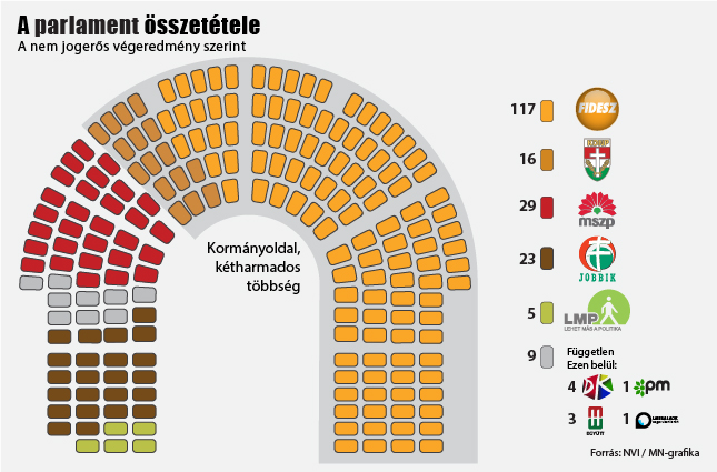 2014. április 14.,hétfő 13:43 |Kétharmados parlamenti többséget szerzett a Fidesz-KDNP az április 6-i országgyűlési képviselő-választáson a szavazatok 99,99 százalékos feldolgozottsága alapján. A Nemzeti Választási Iroda vasárnapra virradó éjjel közölt adatai szerint a Fidesz-KDNP-nek 133, az MSZP-Együtt-DK-PM-MLP-nek 38, a Jobbiknak 23, az LMP-nek pedig 5 mandátuma lesz az új parlamentben.