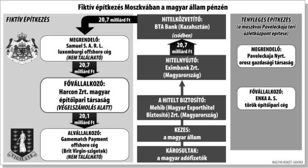 2012. május 31.,csütörtök 12:11 |Az exporthitelezés történetében egyedülálló csalássorozatot tárt fel a Kormányzati Ellenőrzési Hivatal (Kehi), amely feljelentést tett a Legfőbb Ügyészségen a magyar export ösztönzésével megbízott Eximbank és a Magyar Exporthitel Biztosító (Mehib) Zrt., valamint a magyar Harcon Zrt. és egy offshore cég szerződése kapcsán. A kacifántos ügyben a magyar állam tulajdonában álló Eximbank azért juttatott 124,2 millió eurós (mai árfolyamon 37 milliárd forintos) hitelt egy kazah bankon keresztül egy offshore cégnek, mert az azt állította, egy moszkvai bevásárlóközpont kivitelezésében a magyar Harcon Zrt. fővállalkozóként vesz részt. A hitelből ténylegesen 81,2 millió eurót (24,2 milliárd forintot) folyósítottak, de az építkezésen – a ma már végelszámolás alatt álló – Harcon Zrt. egy kapavágást sem ejtett, sőt időközben az offshore cég is eltűnt.