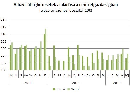 A KSH adatai szerint 2013 májusában a teljes munkaidőben alkalmazásban állók havi bruttó átlagkeresete 232 084 forint volt a nemzetgazdaságban, amely 3 százalékkal magasabb az előző évben regisztráltnál. A nettó bér – mely 152 015 forintot tett ki – 4,4 százalékkal nőtt 2012 májusához viszonyítva, amely azonban nem veszi figyelembe a gyermekek után járó családi adókedvezményeket. A májusi 1,8 százalékos éves inflációval számolva 2,6 százalékkal ért többet a keresetünk reálértelemben.