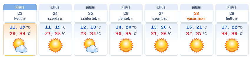 Ma egyébként alapvetően derült, csapadékmentes idő várható az országban. A napsütést többnyire kevés fátyolfelhő szűrheti. Az északi, északnyugati szél napközben időnként megélénkül, zivatar környezetében átmenetileg erős vagy viharos széllökések is lehetnek. A hőmérséklet csúcsértéke 28 és 33 fok között várható, de északkeleten néhol ennél kissé hűvösebb is lehet. Késő este 22–28 fokra számíthatunk.