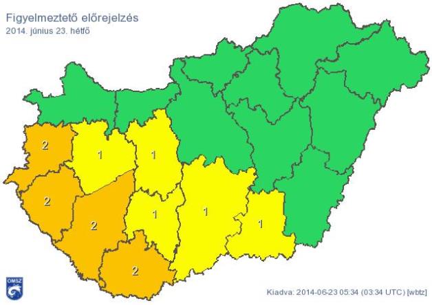 Hétfőn a késő délutáni, esti óráktól nyugat, délnyugat felől egyre nagyobb számban számíthatunk zivatarokra viharos (70-80 km/h) széllökések kíséretében. Főként a délnyugati megyékben heves zivatarok is várhatók, amelyekhez károkozó szél (90-100 km/h-t meghaladó széllökés), nagyméretű jég (2-3 cm-t elérő), illetve felhőszakadás (rövid idő alatt 20-30 mm fölötti csapadék) is társulhat.