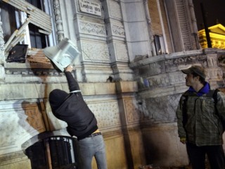 A tüntetők a Fidesz-székház több ablakát is bedobták, és több helyen a redőnyöket is megrongálták.