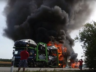 Ma dél körül egy autószállító kamion gyulladt ki a 86-os főúton, Bősárkány közelében. A tűzről videót tett közzé a 112 Press.
