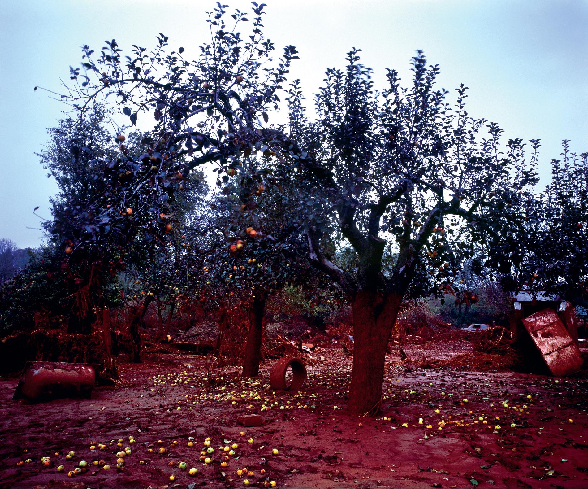 A katasztrófáról megjelent képek nagy többségétől az különbözteti meg ezeket a fotókat, hogy Kollányi Péternél eltűnik a tájból a szenvedő ember, ahogyan a vöröslő bundájú, kétségbeesett állatok is. Az életet legfeljebb egy almafa jeleníti meg, amely sárgászöld gyümölcsöket hullat a vörös talajra.