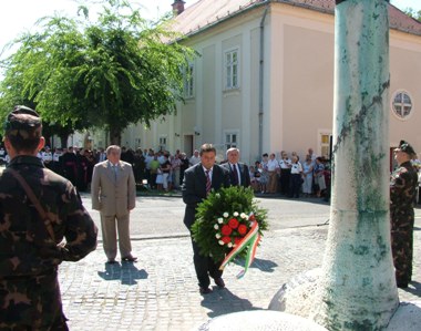 Az egyházi megemlékezés után Kalocsa Város Önkormányzatának képviselő-testülete tartott megemlékezést a Szentháromság téren lévő Szent István szobornál, ahol a Himnusz hangjai után, városunk címzetes főjegyzője, dr. Bálint József mondott ünnepi beszédet azon a helyen, amely minden szállal kapcsolódik államalapító királyunk munkájához. A jegyző történelmi visszatekintésében így fogalmazott: