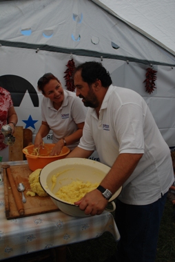 A tésztagyúrás aztán már a két szakácsra maradt, de aztán többen is segítségükre siettek. Nemcsak a krumplitörésbe, hanem a „gombócozásba” is egyre több szorgos kéz kapcsolódott be, a kifőzésről már nem is beszélve, hiszen a szakácsoknak a szakmai zsűri előtt volt jelenésük a már elkészült paprikás gombócokkal.