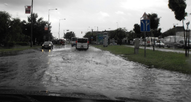 Már hosszú évek óta probléma, hogy az 51-es út és a Hunyadi János utca kereszteződésében nem megoldott a csapadék elvezetése. Ennek köszönhetően ismét az autók tengelyéig ért a víz az úton, amelyen csak a kamionok tudtak biztonsággal áthajtani.