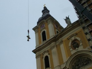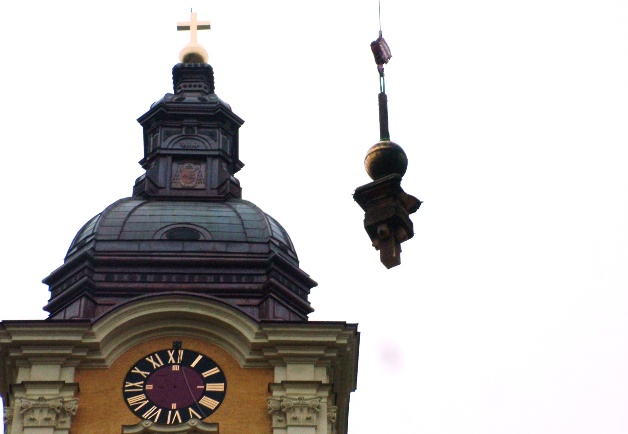 Majd’ egy év telt el azóta, hogy a kalocsai Főszékesegyház északi tornyáról leemelték a keresztet és a X. Pius Pápa ereklyéjét tartalmazó gömböt. Az északi torony felújítása elkészült, már a déli torony felújításán fáradoznak a kivitelezők. Szeptember 8-án reggel kezdték el összeszerelni azt a hatalmas méretű darut, amely leemelte a keresztet és a gömböt.