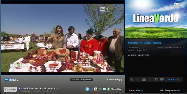 A Bakodpusztán felvett anyagot – melyben egy Kalocsa környéki piac elevenedett meg Dél-alföldi ételekkel, híres minőségi borainkkal, füstölt húsáruinkkal, és természetesen a kalocsai paprikával – tegnap (vasárnap) tűzte műsorára az olasz csatorna, Linea Verde című műsorában.
