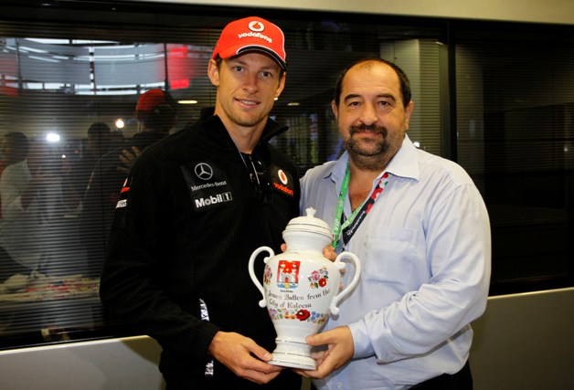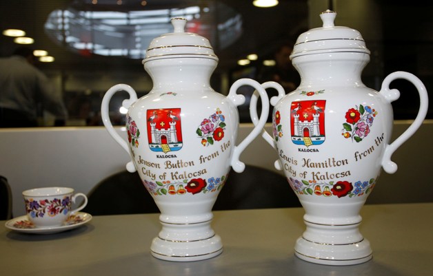 - Úgy vélem, óriási megtiszteltetés volt városunk számára, hogy a McLaren csapat pilótái szombaton a kalocsai mintával ellátott overall-ban ültek a volánhoz. A száguldó cirkusz adta nyilvánosságnak köszönhetően a világ minden táján elhangzott városunk neve. Ezért döntöttünk úgy, hogy köszönetünk jeléül Kalocsa nevében olyan ajándékokat adunk át, amelyek maradandóak és amelyek hűen tükrözik azt az élő motívumvilágot, mely közel két évszázada fundamentuma a kalocsai népművészetnek. – nyilatkozta Török Ferenc, aki vasárnap egy kalocsai mintával ellátott porcelánserleget adott át Buttonnak és Hamiltonnak.