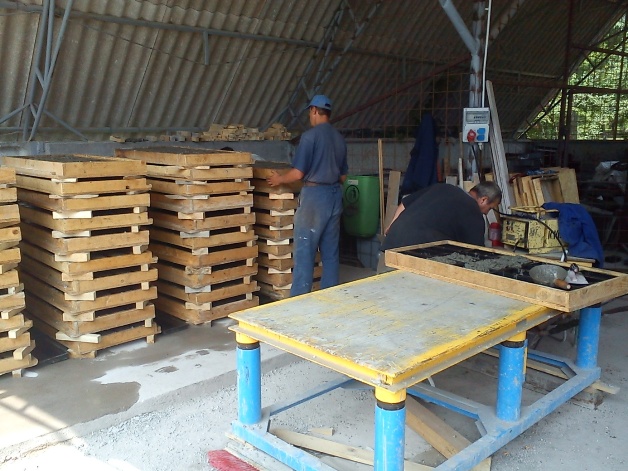 Télen teljes kapacitással, az év többi időszakában igény és lehetőség szerint üzemelő gyártósoron 6 cm vastagságú, 10x20-as, illetve 10x10-es méretű térkő elemek, valamint 40x40-es, 5 cm vastag árokmeder-lapok, forgalomszabályozó elemek és mobil virágágyások készülhetnek, huszonnégy fős létszámmal. A termékek helyben készült betonból, fröccsöntött műanyag sablonba helyezve, rázóasztalon előkészítve, érleléssel készülnek.