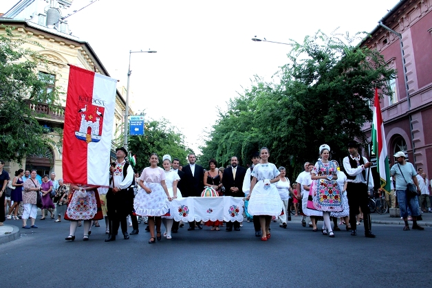 Este héttől indult a fölvonulás a Szentháromság térre, elöl haladt – jelképesen – a nemzet kenyere, a Piros Rózsa Együttes és a Kalocsai Hagyományőrző Együttes néptáncosai, valamint a város apraja-nagyja kíséretében.
