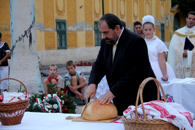 A Főszékesegyház terére érve, a Szent István szobor előtt Geszler Péter káplán megáldotta a nemzeti szalaggal átkötött új kenyeret, amelyet azután Török Ferenc polgármester szegett meg, majd szeletelt föl és osztott szét a jelenlévők között.