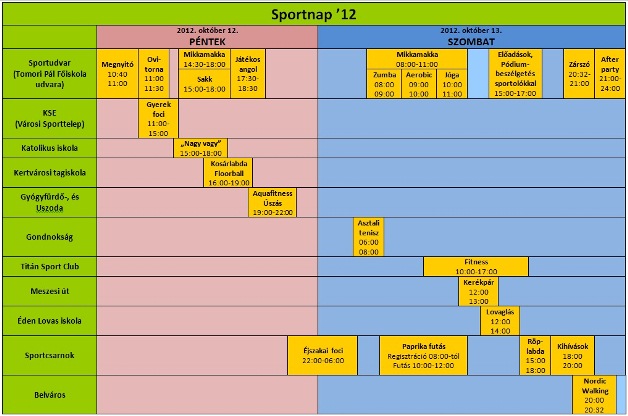A hagyományokhoz híven idén is az adott évszámnak megfelelő számú percig, tehát most 2012 percen át mozognak a résztvevők a Sportnapon Az esemény célja az egészséges életmód igényének kialakítása, a szabadidő hasznos eltöltésére való nevelés és a sport népszerűsítése a mozgás fontosságának hangsúlyozásával, valamint a város bel-, és külterületén zajló ingyenes programok keretében a lakosság megmozgatása az apró gyermekektől a felnőtt korosztályig.