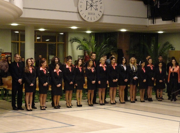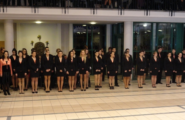 A Szent István Gimnázium szalagavató rendezvényét múlt pénteken 17 órától tartották a Nagyasszonyunk Katolikus Intézmény aulájában. Kezdésként a negyedikesek a négyszögű csarnok három oldalán zeneszóra sorakoztak föl osztályonként, majd a Himnusz közös eléneklésével vette kezdetét az ünnepély.