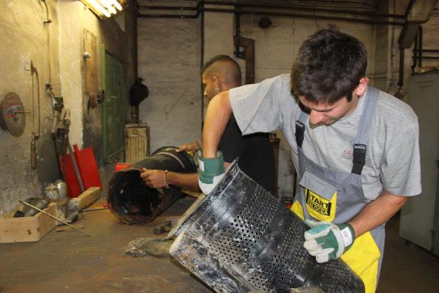 A lakatosműhelyre gyorsan rátalálunk, mert kíméletlen kalapálás hallatszik ki onnét. Balogh Oszkár lakatos, miközben - valószínűleg vandálkodás miatt - behorpadt kukákat igyekszik eredeti állapotukba hozni, elmondja, örült a lehetőségnek, hogy itt dolgozhat, és úgy véli, a jövőben e programnak köszönhetően nőnek az elhelyezkedési esélyei.