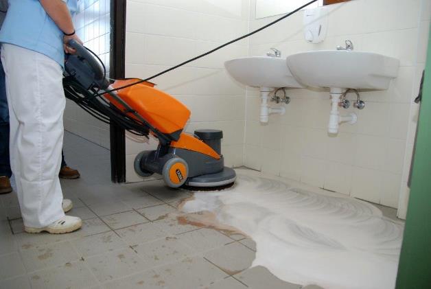Még mi a színeken ámuldoztunk a mosdóban beindították azt a padlótakarító szörnyet, lánynevén egytárcsás súrolót, ami a kis helyiségben nagyon zúgott és habot okádott, viszont cserébe még a fuga eredeti színét is megmutatta a kíváncsi szemeknek. Volt még egy kétvödrös felmosási kísérlet is. Már-már csúszkálva közelítettük meg egymást az iskola folyosóján, amikor a híres súroló automatához értünk. Kiderült ez a cég legutóbbi szerzeménye. Cikázni is kezdett vele egy úr a folyosón, gyorsan igazolva az állítást, hogy a nagy felületek takarításában gyors és hatékony eszközzel állunk szemben, melynek a sok közül az egyik legnagyobb előnye, hogy úgymond fel is töröl maga után, vagyis felmos ugyan, de rögvest meg is szárítja a talajt, így maga mögött nem egy 20 percig csatakos felületet hagy, hanem száraz, járható metlakit.