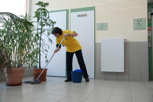 A folyosó végén lévő takarító hölgy a kezdeti megoldásokat mutatta be. Nála egy vödör és egy felmosó volt mindössze. Tudják, azzal a kis kócos fejjel, ami egy-egy szálát minden szék lába alatt otthagyja emlékeztetőül, hogy felmostunk.
