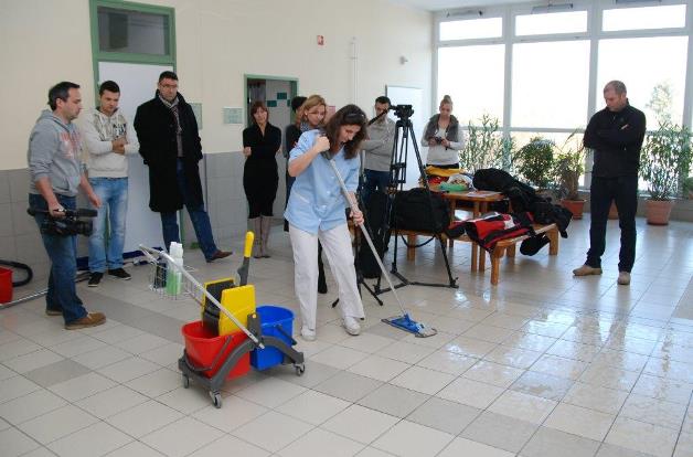 A gép oda-vissza járt a folyosón. Eközben Faragó Gábor megerősítette a megkoreografált fejlődési folyamatot azzal, hogy elmondta: amikor megkezdődött a feladatok átvétele, akkor mondhatni otthoni módszerekkel végezték a takarítók a takarítást.