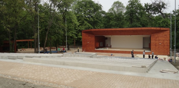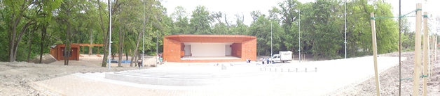 A másik irányba pillantva ugyanis már egy elegáns, faborítású épület áll az egykori „betonplacc” helyén, a színpadtól a víztorony felé tekintve pedig térkövezett lépcsőkön megközelíthető, rendezett széksorok kezdődnek kirajzolódni.