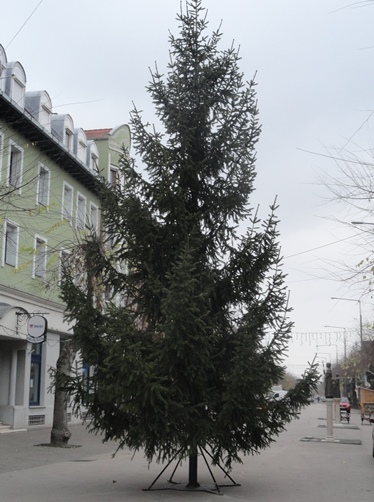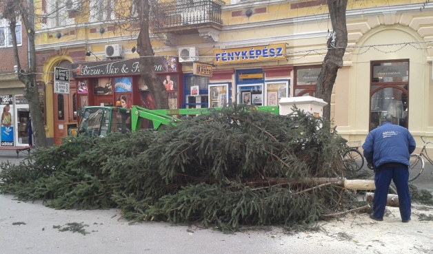 Ma délelőtt házhoz mentek érte, délutánra pedig már fel is állították városunk karácsonyfáját a sétálóutcában. A díszek holnap kerülnek fel rá.