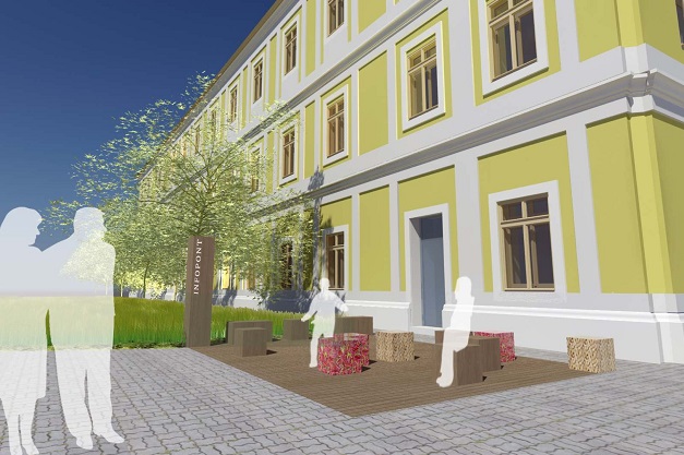 A létesítménybe az épületnek a Szentháromság szoborra néző sarkánál lehet majd bejutni, ahol a bejárat előtt utcabútorok lesznek kihelyezve. Az épület műemlék jellegének megfelelően a külső meglehetősen diszkrét lesz, a figyelmet egy szintén nem hivalkodo „infópont” oszlop, valamint maguk a frekventált helyen elhelyezett utcabútorok lesznek hivatottak fölkelteni.