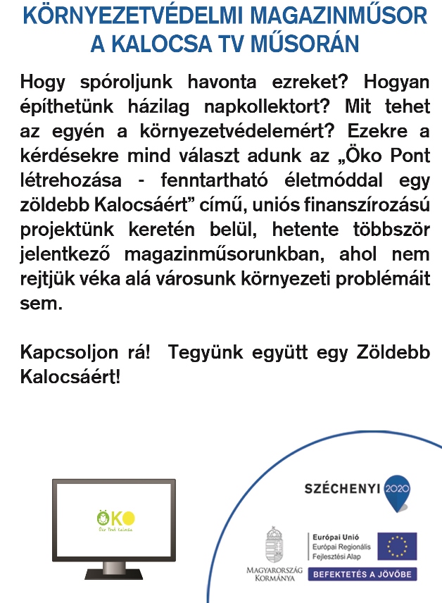 Hogyan spóroljunk havonta ezreket? Hogyan építhetünk házilag napkollektort? Ezekre a kérdésekre is választ kaphat a KalocsaTV műsorán hamarosan induló az „Öko Pont létrehozása – fenntartható életmóddal egy zöldebb Kalocsáért” című, hetente többször jelentkező magazinműsorban.