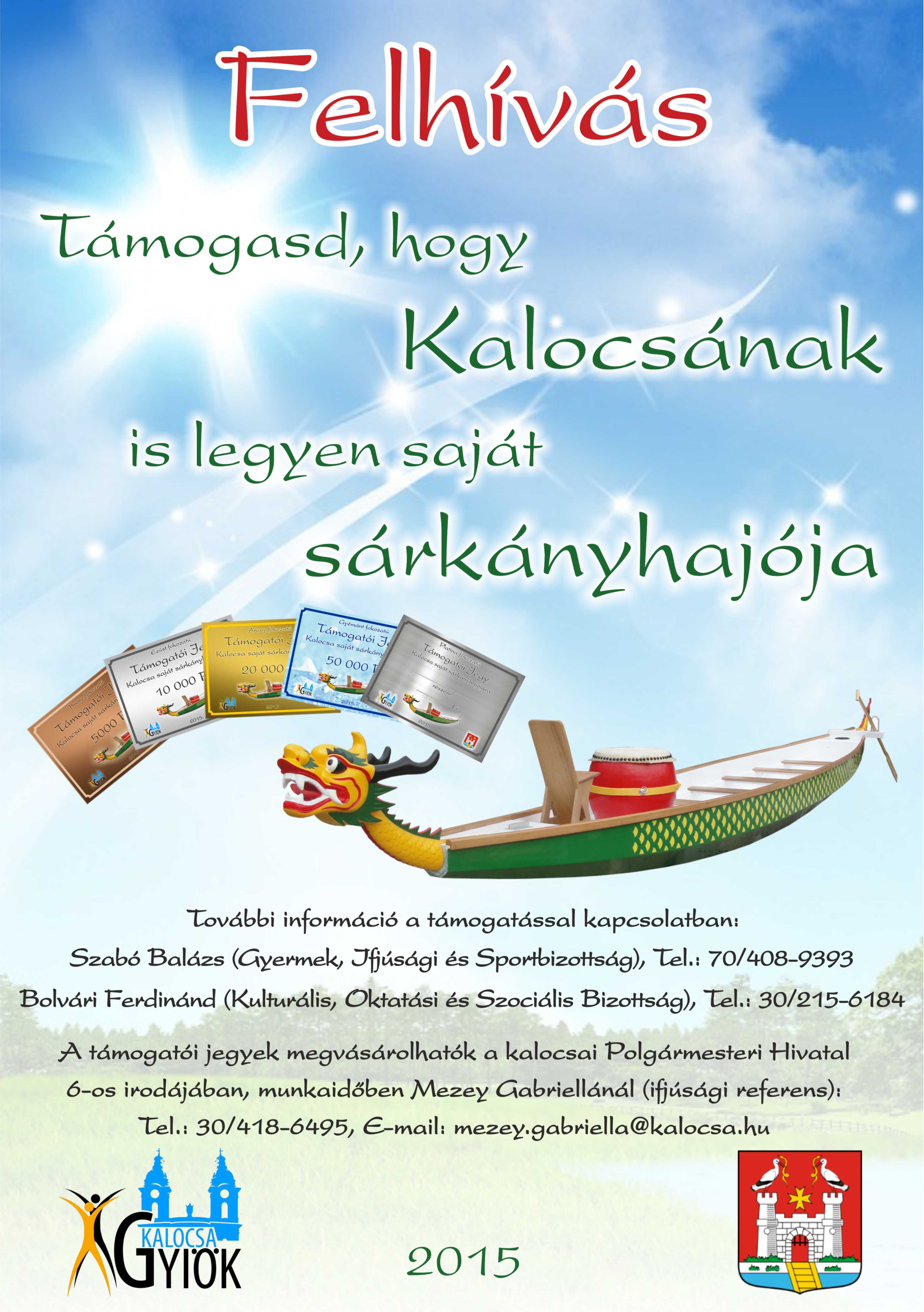 2015. március 02.,hétfő 17:22 |A képviselő elmondta: eredendően Bolvári Ferdinánd javasolta a Gyermek, Ifjúsági és Sport Bizottság alakuló ülése során, hogy az évről évre népszerűbb sárkányhajó kupa ne korlátozódjon egy párnapos versenysorozatra, hanem más alkalmakkor is vízre szállhassanak, akik örömüket lelik ebben a látványos tömegsportban. Javasolta, vásároljon Kalocsa egy ilyen hajót, és e célra fölajánlást is tett. Miért is ne szélesedhetne e szabadidős sport valódi tömegsporttá városunkban?!