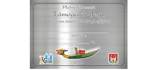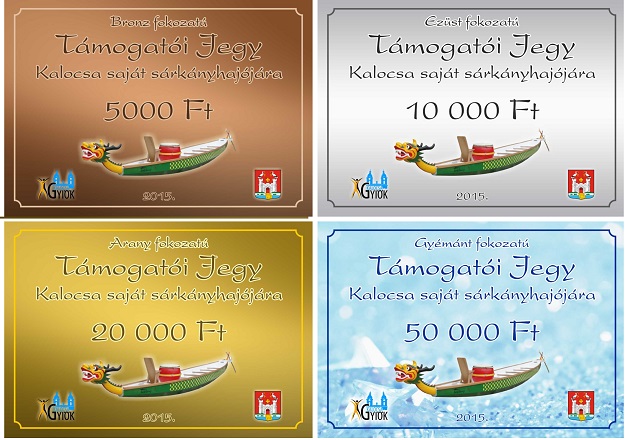 Ennek intézményesítésére négyféle támogatójegyet bocsátanak ki: a bronz ötezer, az ezüst tízezer, az arany húszezer, a gyémánt pedig ötvenezer forinttal gyarapítaná a sárkányhajóra vásárlására fordítható összeget.