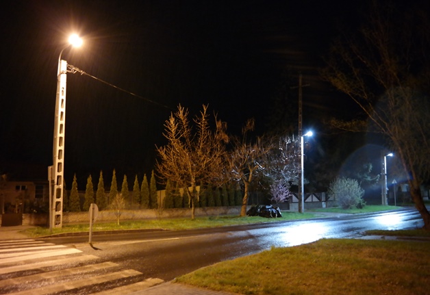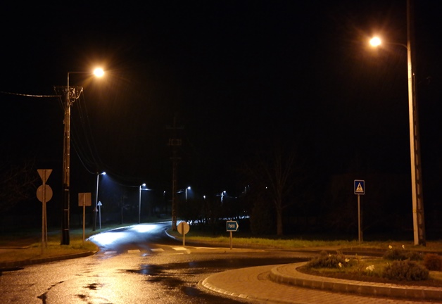 Jól látszik a különbség a régi lámpatestek sárgás, szétszóródó fénye, és az új, LED-es világítás irányított fénye között