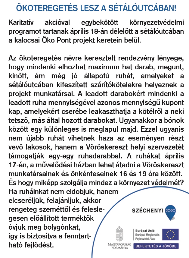 A karitatív akcióval egybekötött környezetvédelmi programot a kalocsai Öko Pont projekt keretein belül április 18-án tartják.