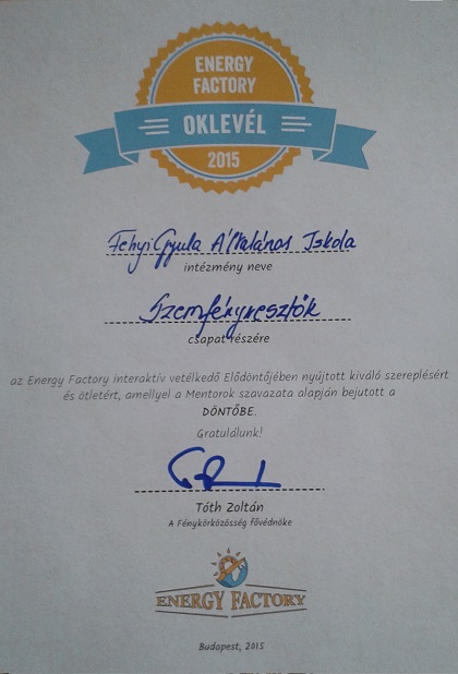 2015. április 04.,szombat 02:54 |A Kalocsai Fényi Gyula Általános Iskola (Kertváros) 6/a osztályának életében nyerő nap volt március 28-a. Ezen a napon indultunk Budaörsre az Energy Factory országos elődöntőjére, szülőként kísérve az osztály csapatát.