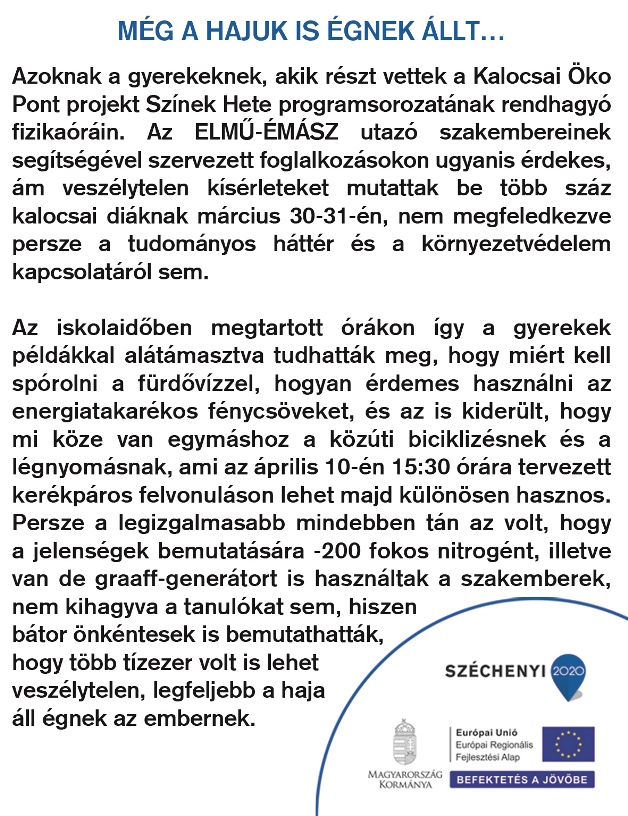 Még a hajuk is égnek állt azoknak a gyerekeknek, akik részt vettek a Kalocsai Öko Pont projekt Színek Hete programsorozatának rendhagyó fizikaóráin.