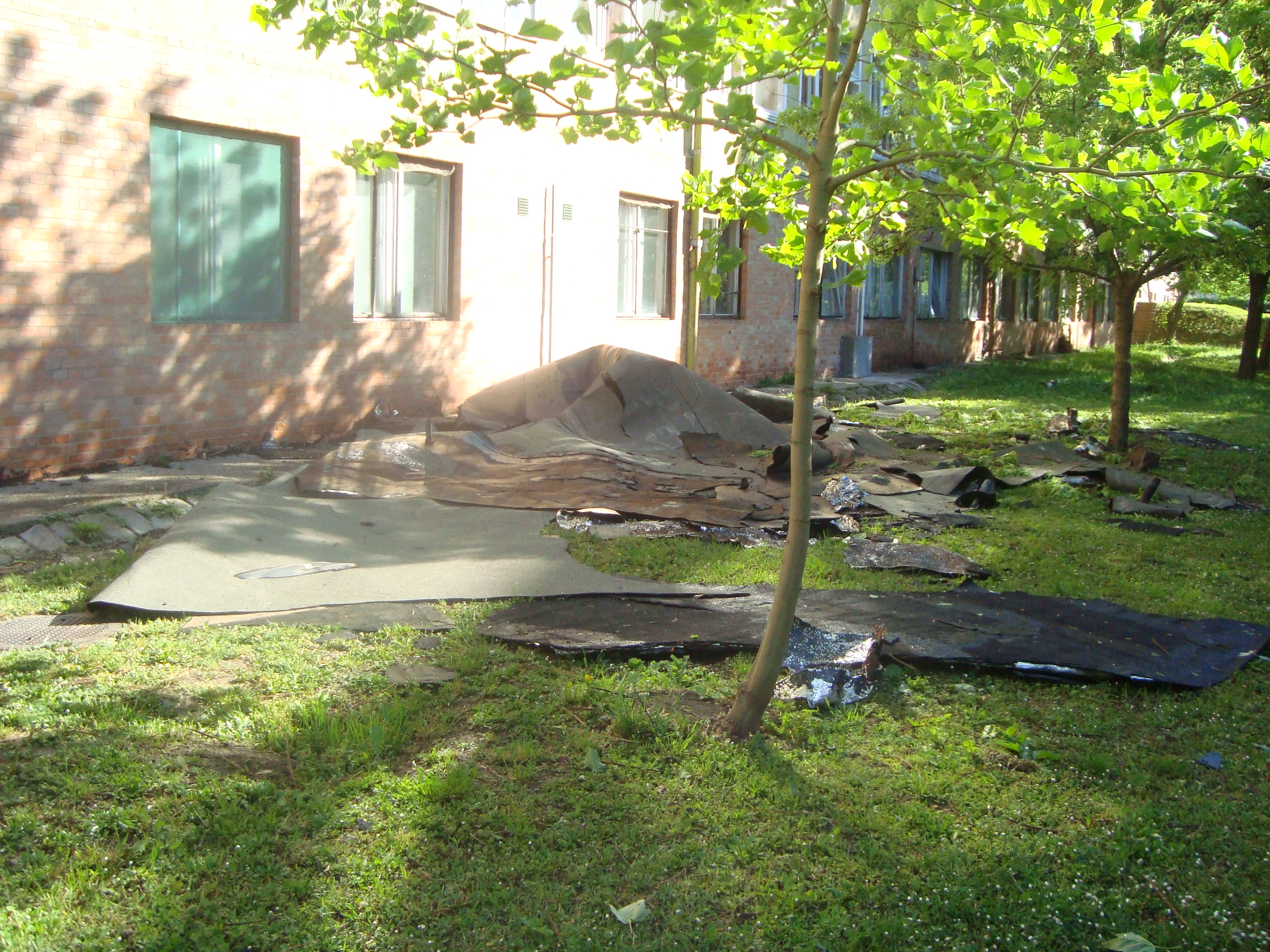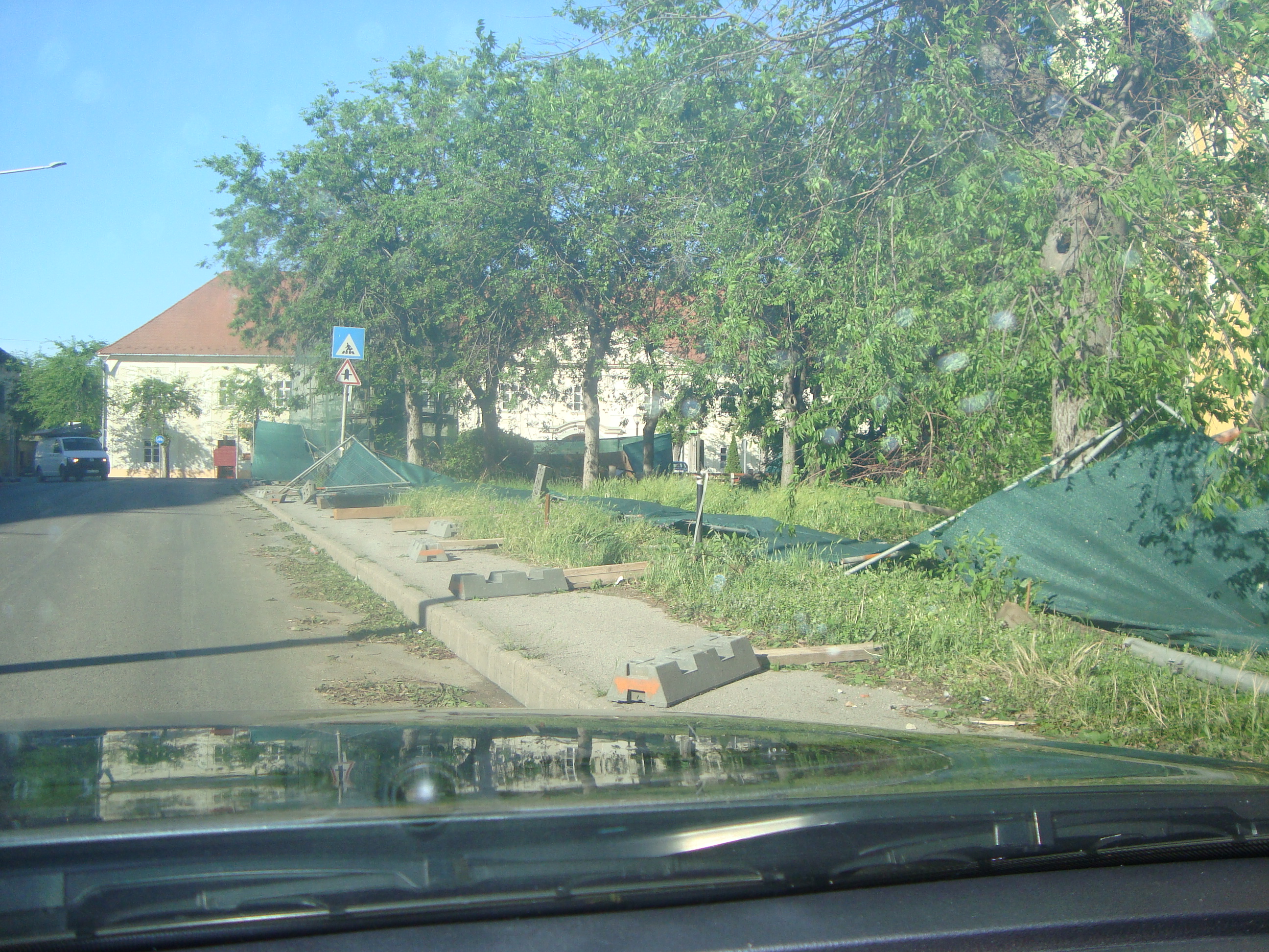 Lencsevégre is kaptunk egy autót, amelynek az uszoda parkolója előtt a szélvédőjére zuhant faág okozott károkat. Az uszoda udvarának nyíltabb térségbe érve egyébként még szilajabbat rúgott a vihar, itt egy fát tövestől fordított ki a helyéből.