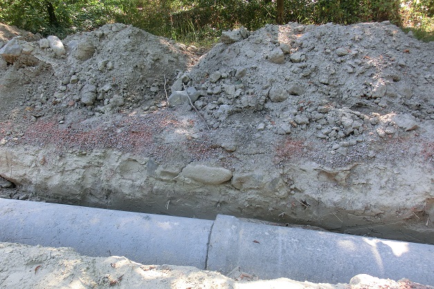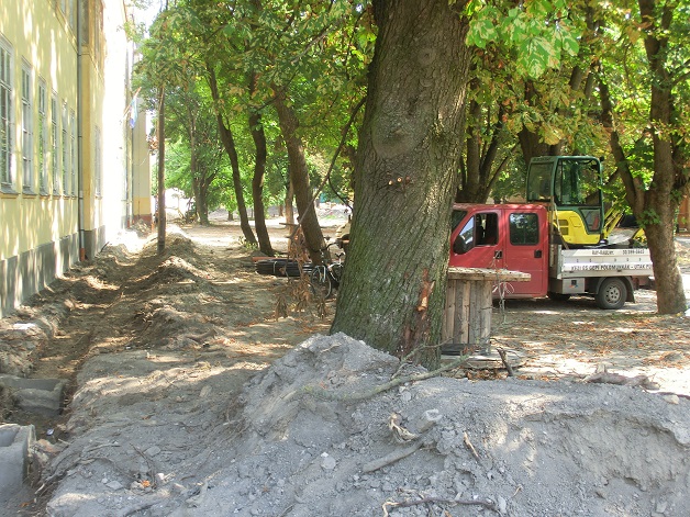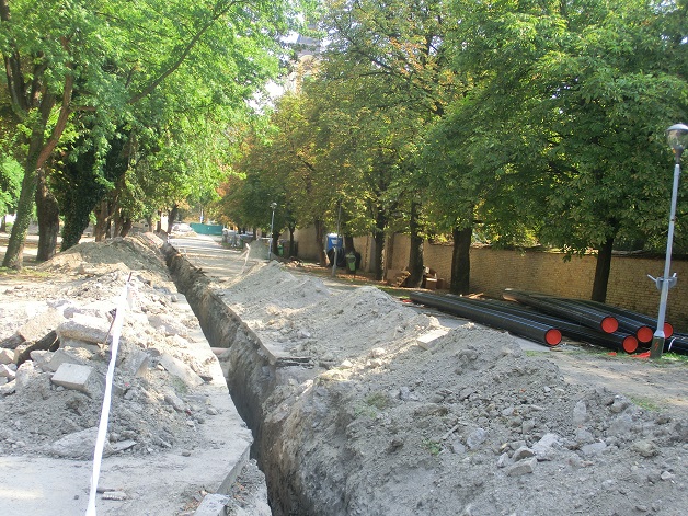 Árkok vágják keresztül az Asztrik-teret, nemcsak az előbbi képen látott helyen, hanem emitt, az út mentén is. Ezek az árkok nem mindenütt a korábbi közművek helyén futnak, így sokszor hatolnak be eddig bolygatatlan talajba.