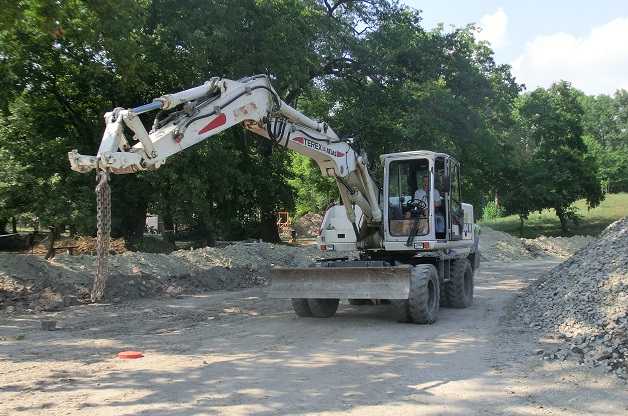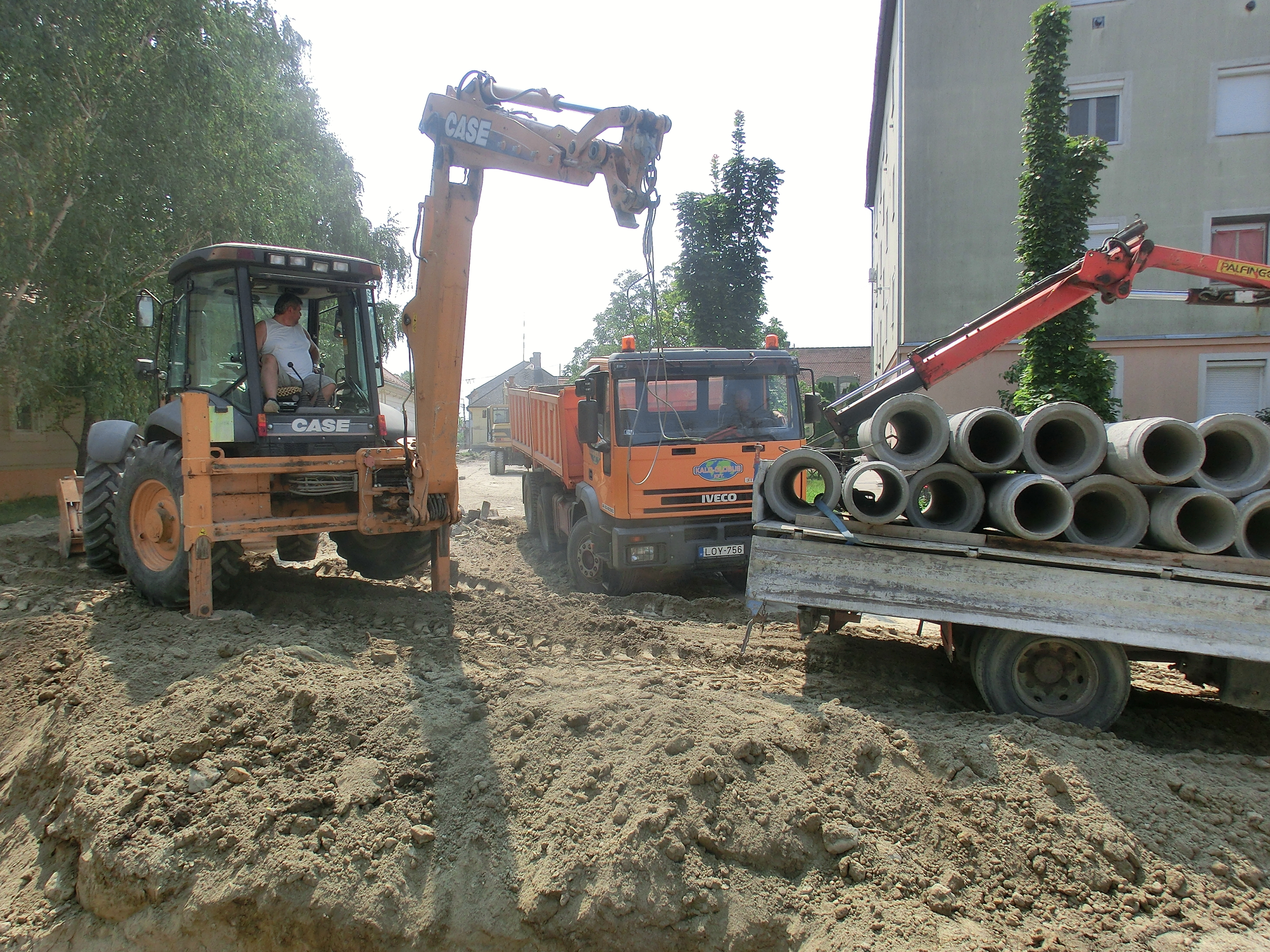 A belvárost úgy ellepték a munkagépek, mint a burgonyaföldet a krumplibogarak. A fönti képen négy gép is nyüzsög egyszerre. Az alábbin pedig egyikük épp egy szennyvíz-elvezető csövet emel a helyére.