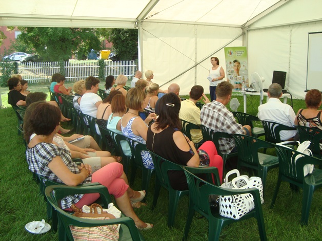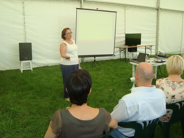 Az „Együtt Egészségesebben – a Szent Kereszt Kórház Kalocsa kistérségi egészségfejlesztési programja” (TÁMOP-6.1.2-11/3-2012-0056) projekt keretében megtartott rendezvény első előadója dr. Zombori Judit szakpszichológus volt, aki jól összeszedett prezentációjában mindazokat a tényezőket számba vette és bemutatta, amelyek az egészségügyben dolgozókat munkájuk során nap mint nap éri. A szakdolgozók, diplomás ápolók képzésében is részt vevő szakember számos olyan tanáccsal látta el a rekkenő hőség ellenére is érdeklődő közönséget, amelyek segíthetnek a stressz és a kiégés elkerülésében, kezelésében.