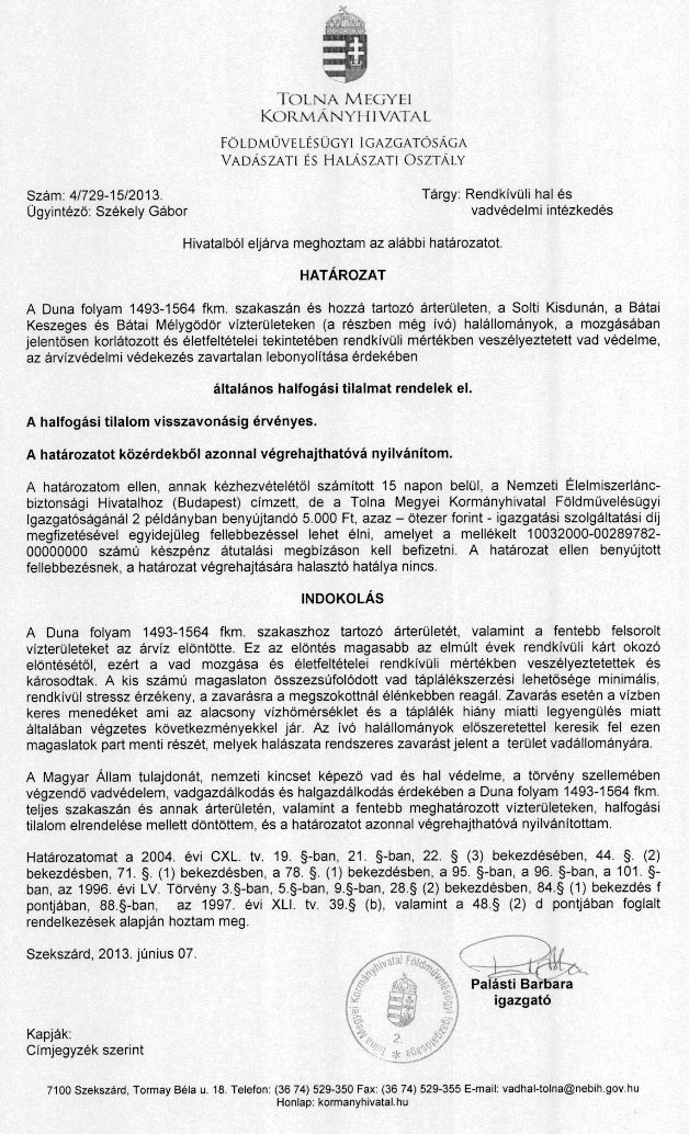 Általános halfogási tilalmat rendeltek el a Duna egyes szakaszain. A tilalom – amely visszavonásig marad érvényben – az árvíz miatt veszélyeztetett hal és vadállomány védelmének érdekében lépett életbe.
