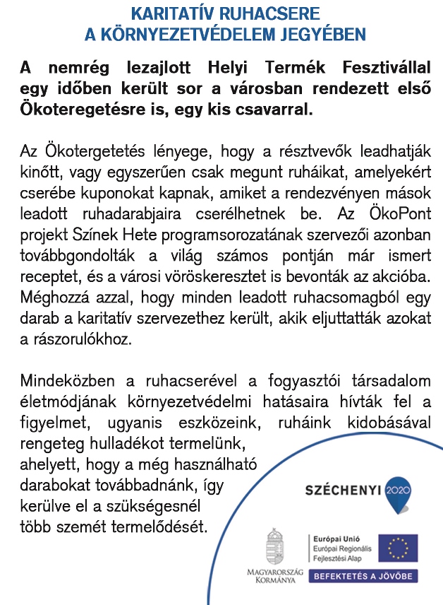Szombat délelőtt a sétálóutcában került sor az első kalocsai Ökoteregetésre. A városi vöröskereszt bevonásával megvalósított rendezvénnyel a számos ruhadarab csere-beréje mellett, a hulladéktermelés környezeti hatásaira hívták fel a figyelmet a szervezők.
