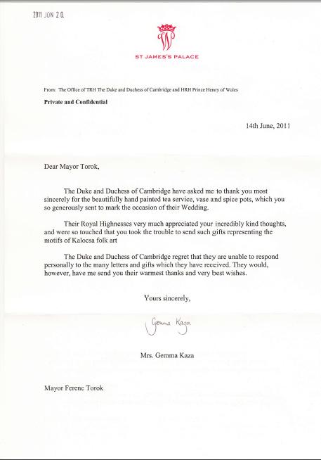 „Ő Királyi Fenségük nagyra értékelték Polgármester Úr kedves gondolatait és meghatotta őket, hogy vette a fáradságot és ilyen szép, a kalocsai népi motívumokat felvonultató ajándékokat küldött számukra. ” – áll a köszönőlevélben, melyet II. Erzsébet Királynő királyi postáján adtak fel június 15-én.