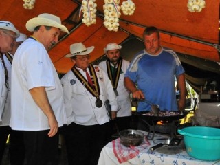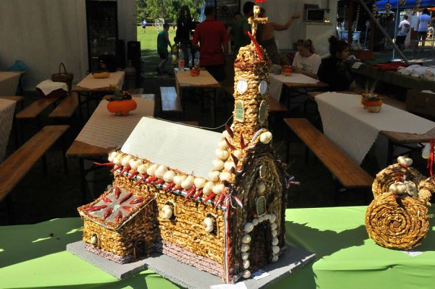 A gasztronómiai verseny első felvonásaként az otthon készült sós és édes házi sütemények megmérettetése, valamint a szintén otthon, előre elkészített hagymafonatok szépségversenye következett. Utóbbiakra talán jobban illene a fokhagymaszobor kifejezés, hiszen a benevezett alkotások között a bátyai tájház fölismerhető makettje, egy focicipő modellje, egy focikaput formázó vaskeretre és a rákötözött dróthálóra erősített fokhagymafüzérekből álló kompozíció mellett még egy templom makettjét is megtalálhattuk. A zsűri tetszését leginkább ez utóbbi pályamű nyerte el, de a valószínűleg legmunkásabb, mintegy két héten át készült focikapu, valamint a többi fokhagymacsoda készítői is minden elismerést megérdemelnek.