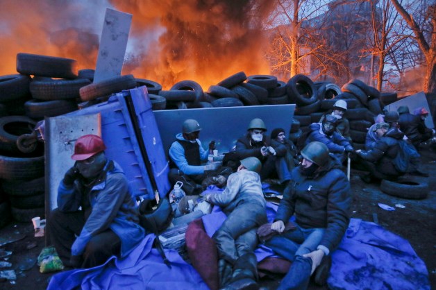 Kormányellenes tüntetők pihennek égő barikádok mellett a Függetlenség tere közelében Kijevben 2014. február 20-án. (MTI/AP/Efrem Lukackij)