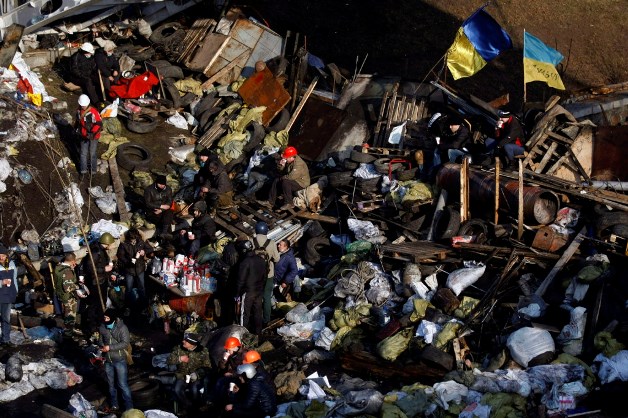 Kormányellenes tüntetők megerősítik barikádjukat a Függetlenség terén Kijevben 2014. február 20-án. (MTI/AP/Marko Drobnjakovic)