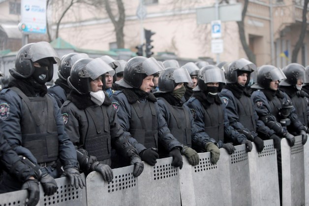 Rohamrendőrök sorfala a kormányhivatal előtt Kijevben 2014. február 20-án. (MTI/AP/Efrem Lukackij)