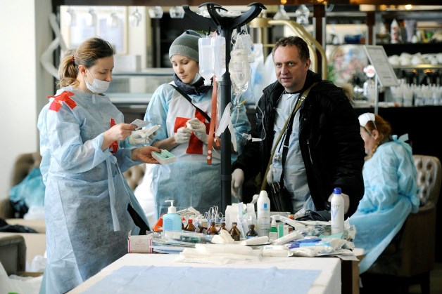Ideiglenes kórház a Hotel Ukrajna épületében a kormányellenes tüntetőt és a rohamrendőrök összecsapása után Kijevben 2014. február 20-án. MTI Fotó: Beliczay László