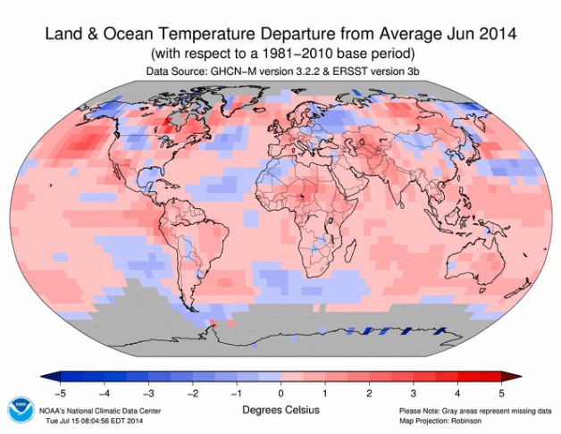 Az NOAA rózsaszín és piros színnel jelzi, ahol a 2014 júniusi átlaghőmérséklet magasabb volt az átlaghoz képest (szürke: nincs adat) Forrás: NOAA