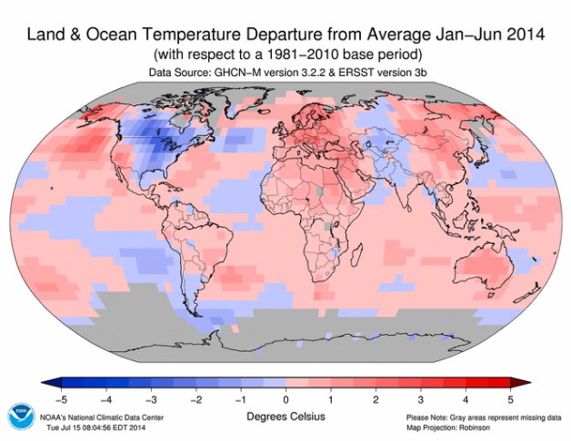 Az NOAA rózsaszín és piros színnel jelzi, ahol a 2014 január-júniusi átlaghőmérséklet magasabb volt az átlaghoz képest (szürke: nincs adat) Forrás: NOAA