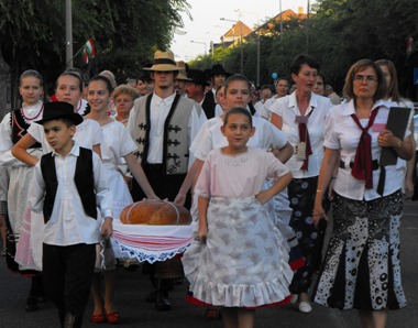 Ez évben is Török Gusztáv Andor, Kalocsa város polgármestere szelte fel a megáldott kenyeret, amelyet szokás szerint szétosztottak a téren állók közt, akik a Regélő Fehér Táltos Dobcsapat kíséretében vonulhattak vissza a sétáló utcába, ahol a Hagyományőrző Népi Együttes és a Hétszínvirág Alapfokú Művészetoktatási Intézmény műsora után léptek színpadra. A két évvel ezelőtt alakult együttes azért kelt életre, hogy megjelenítse az ősi magyar értékeket és felébressze a hitet és szeretetet az emberek szívében, vigye a fényt az összefogásért, az egységért, magyarságunk újjászületéséért. Ennek szellemében léptek színpadra és ragadták magukkal a közönséget, akik kitörő vastapssal jutalmazták a dobcsapatot, akik valóságos közelbe hozták honfoglaló őseink hagyatékát, és a Szent István-i hit erejét.