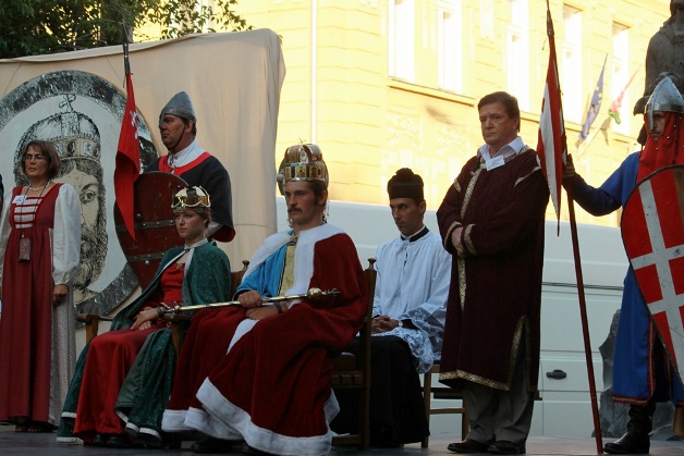 A kerettörténet: 1011. kisasszony havának 21. napján, országlásának 10. évfordulóján István király végiglátogatja a vármegyéket, ellenőrzi a tisztségviselőket. A király és a királyné a felzendülő fanfár hangjaira lóháton érkezett. A királyi rezes kvartett vezetőjétől, Fehárvári Istvántól megtudtuk, hogy országosan is ritkaság, Kalocsán kívül talán csak a Zeneakadémián lehetséges, hogy a Verdi operája után Aida-trombitának nevezett, hosszú, egyenes csövű, reneszánsz kori hangszerekből négy szólaljon meg egyszerre. A fanfárok egyébként még többször fölharsantak színjáték során. A királyi párt az alispán (Simon Zoltán alpolgármester) és az érsek (Váradi Richárd) köszöntötte, majd felkísérték őket színpadra. Három apród koronákat és a jogart hozott. Ez után az érsek megkoronázta a királyt, majd a királynét. Ekkor a város lakóinak minden rendű és rangú polgára sorjában az uralkodói pár elé járult, különféle ajándékokkal halmozva el őket. Elsőként „a városi pénzügyelő, a pénzszámláló, és a kamarás képviselő” érkezett (Juhász Gábor, Rumi László, Szabó Patrik), kezükben egy-egy zsák „arannyal”, majd újabb városi elöljárók jöttek (Humán Erőforrás Bizottság, élükön Turi Tibor), s átadták az uralkodónak a város zászlaját. Utánuk a vitézi rendek, a „király hangos szavú csőszei” (a csőszi hagyományőrzők) járultak a trón elé, hadibemutatóval kedveskedve a királynak s népének.