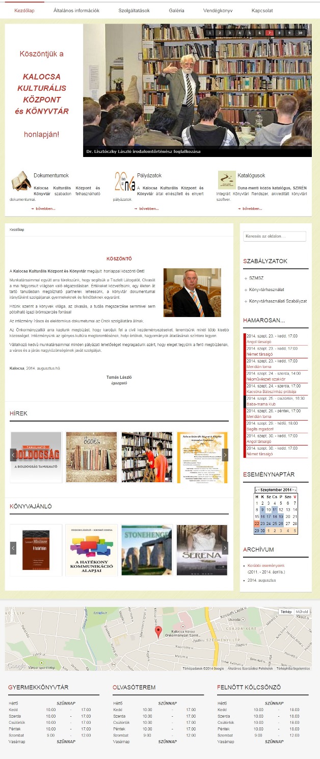 Farkas Beáta annyi kulisszatitkot elárult a megújult www.kalocsakkk.hu weboldal kapcsán, hogy a korábbi honlap legnépszerűbb elemeit emelték át, és gyúrták össze az újonnan megálmodott és kivitelezett menüpontokkal. Ehhez a munkához előzetesen kikérték a könyvtárba látogatók véleményét is – hangsúlyozta a web-felelős, kiemelvén, hogy induló honlapként az elkövetkező hetekben előfordulhatnak apróbb hibák, működési furcsaságok az oldalon. Amennyiben ilyenre lesz figyelmes, kérik, hogy jelezze azt a weboldalon megadott elérhetőségeken és javítani fogják – szörfölésre fel, klikk!
